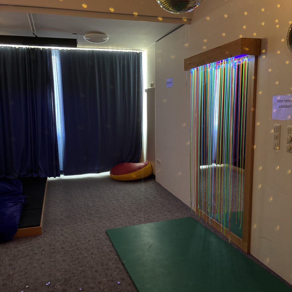Zusätzlich nutzten wir gezielt verschiedene Räume innerhalb der Einrichtung, wie beispielsweise den Snoezelraum. Dieser bot die Möglichkeit, Kinder in kleineren Gruppen gezielt Ruhephasen abseits des Gruppengeschehens zu ermöglichen.
